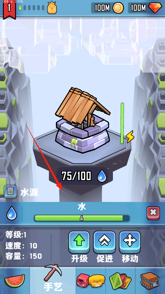 3、针对“水源”设施,利用“升级,促进,移动”等功能按钮,提升其等级、速度和容量。