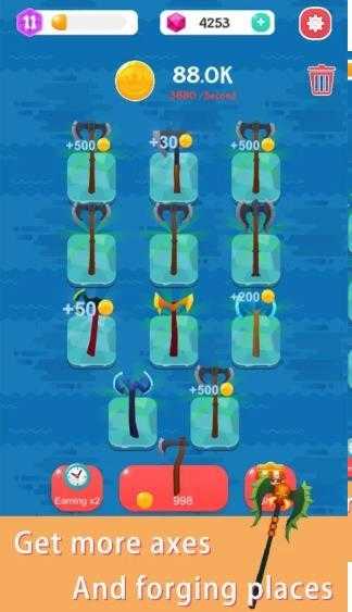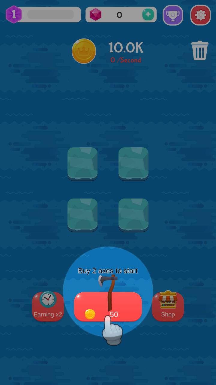 1、游戏开始时,按照提示【Buy 2 axes to start】,花费50金币购买2把斧头,开启游戏进程。