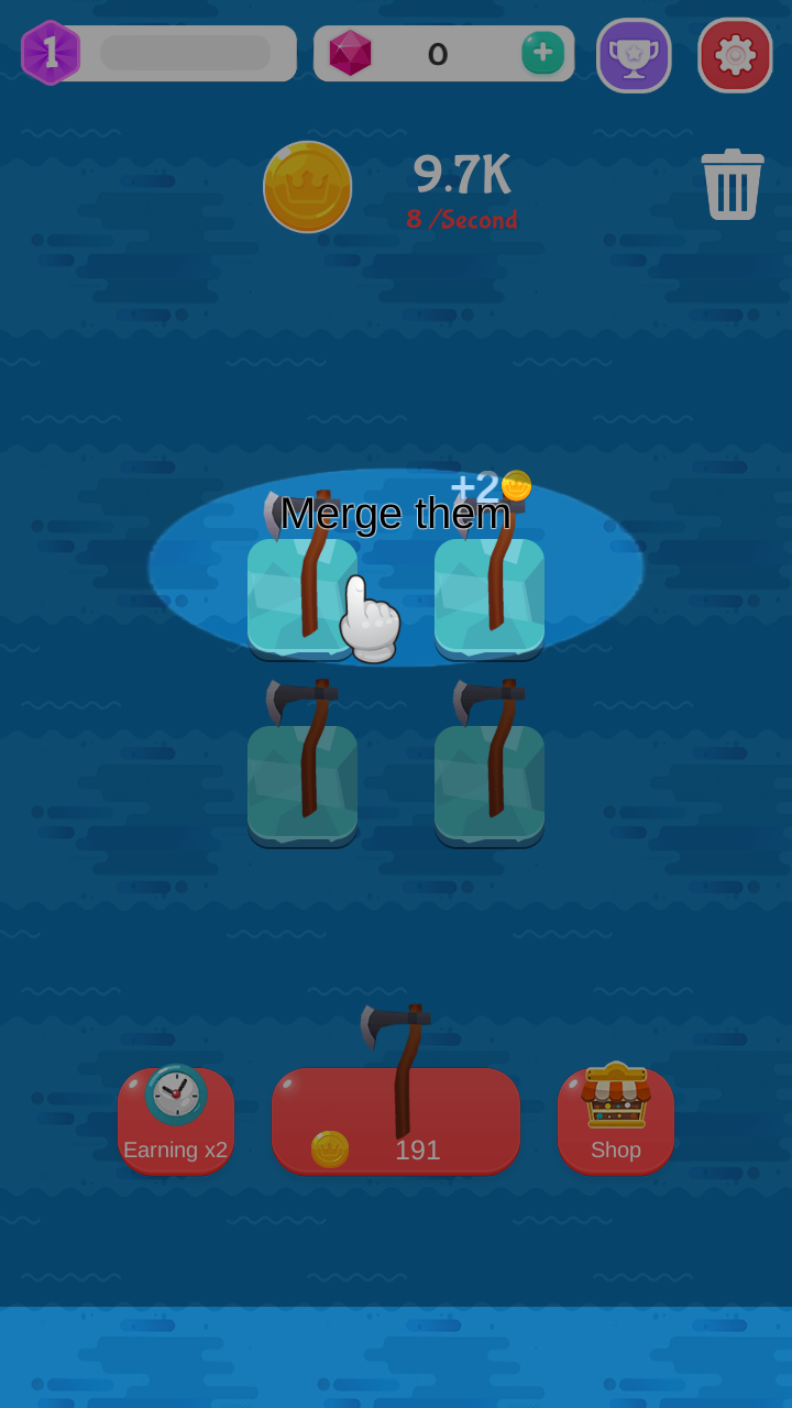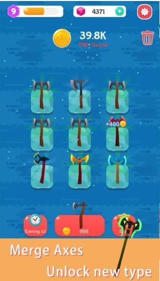2、当出现【Merge them】提示时,将相同的斧头进行合并操作,提升金币收益,留意屏幕上方的金币数量。