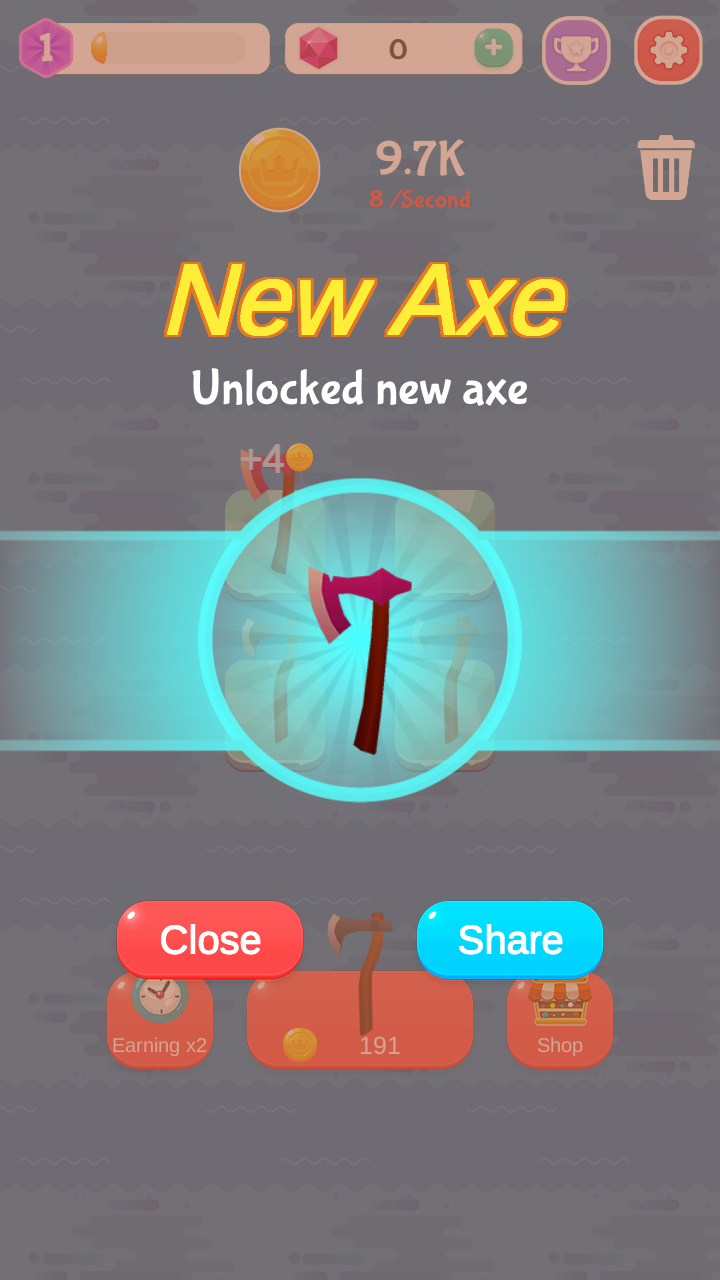 3、成功解锁新斧头后,看到【New Axe】和【Unlocked new axe】提示,可选择点击【Close】关闭提示。