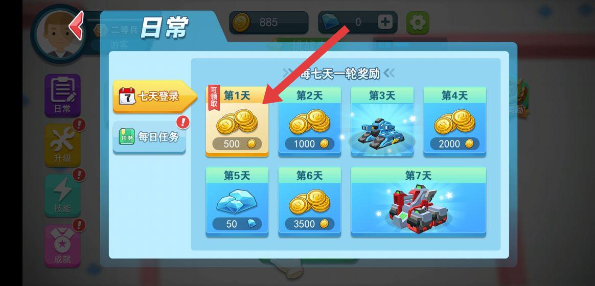 1、在日常的界面,可以领取第1天登录奖励500金币,积累资源用于后续技能升级或购买道具。