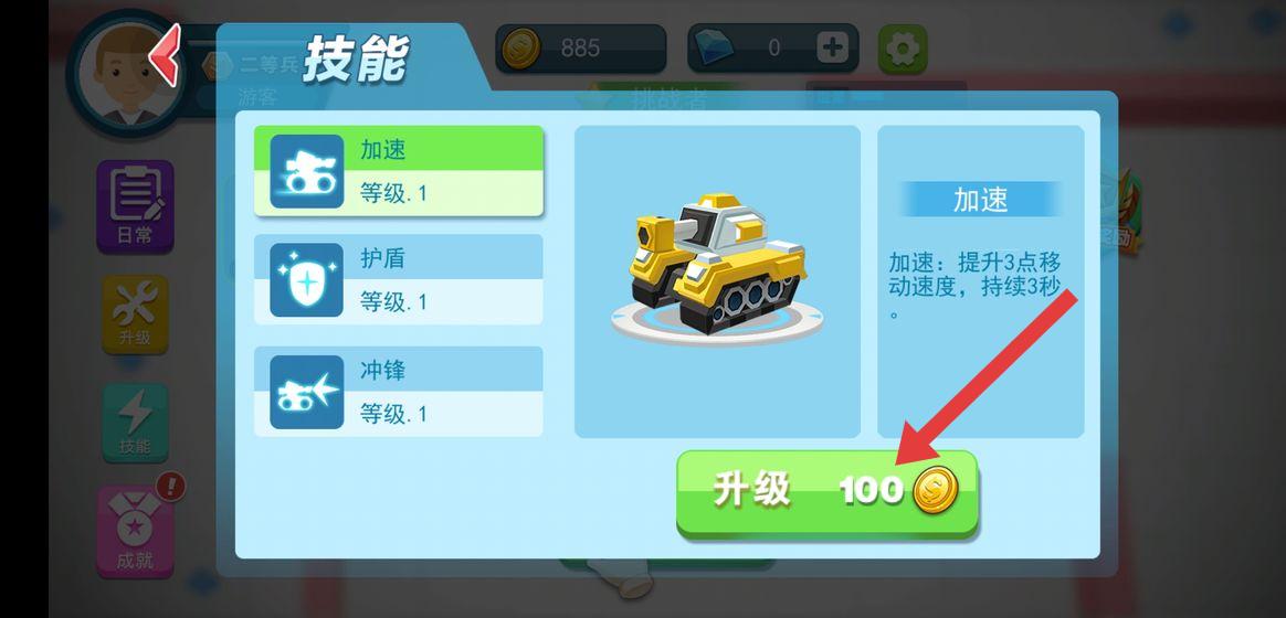 3、在重装坦克争霸的技能界面,点击【升级100金币】按钮,消耗金币提升加速技能等级,增强移动速度。