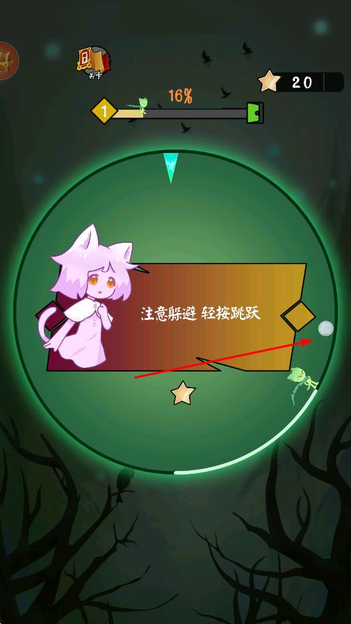 1、进入游戏后点击开始按钮,在环形轨道界面滑动手指调整角色位置,避开旋转的白色星球,沿着轨道缝隙向前移动。