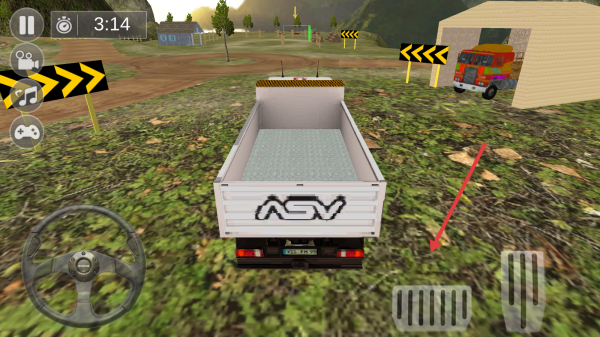 3、在驾驶场景中,通过屏幕左下角的方向盘控制卡车方向,利用右下角的刹车和油门按钮(如箭头所指)控制车辆行驶。