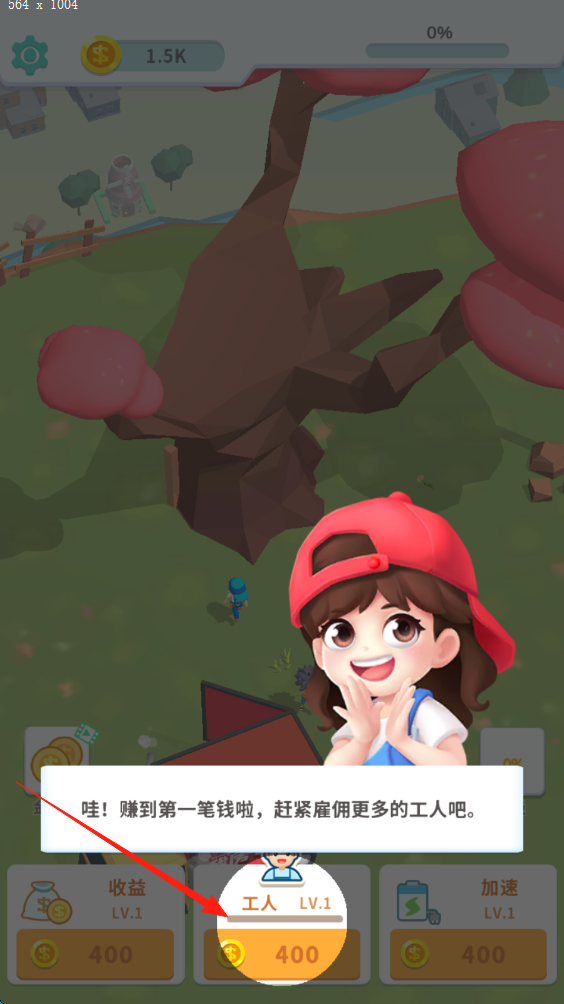 2、当赚取到第一笔钱后,按照提示“赶紧雇佣更多的工人吧”,点击“工人”选项雇佣或升级工人。