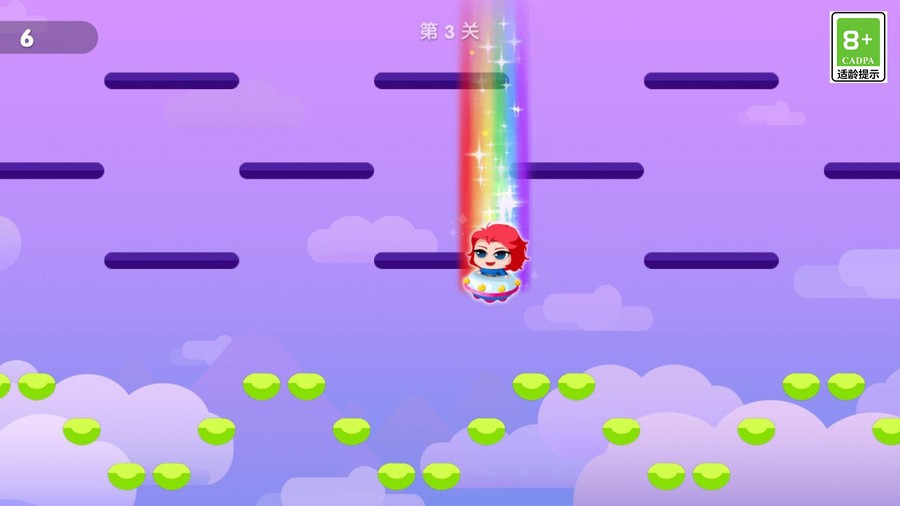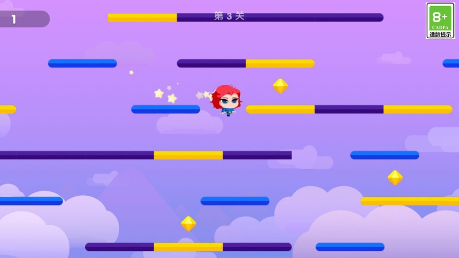 1、萌系视觉风格:采用Q版卡通画风,角色表情丰富(如跳跃时兴奋挥臂),场景细节生动(如沙漠地图滚动的仙人掌、星空地图闪烁的流星),营造轻松冒险氛围。