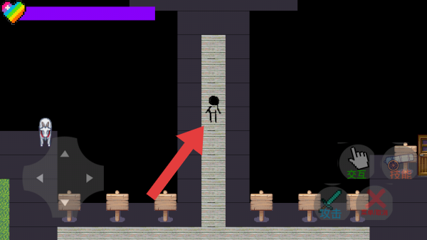 2、采用像素风格。画面中,火柴人位于高处墙体上,左上角紫色长条代表生命值,玩家可借此操控角色移动、与场景互动、释放技能、进行攻击等,在世界中展开冒险。