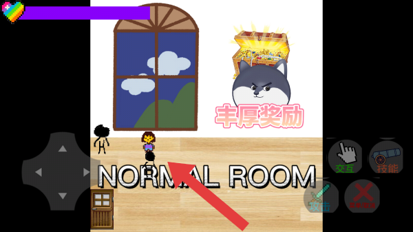 3、右侧有猫咪图案及丰厚奖励字样,暗示此处完成任务或达成条件可获奖励,屏幕下方和右侧有方向控制,供玩家操控角色互动与冒险。