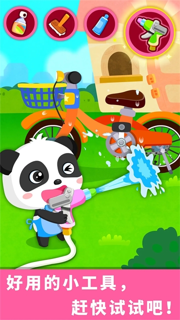 4、玩具护理关卡中设有泡泡浴、自行车去锈等趣味内容,提升孩子对物品维护意识的同时增强趣味性。