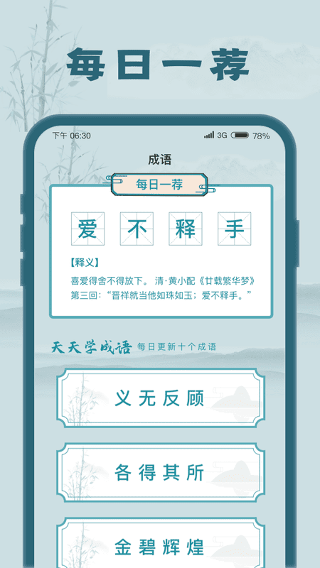 3、详细知识解读:每一个成语关卡都配有详细解释,涵盖成语含义、出处、用法示例等,助力玩家全方位理解成语。每日还会更新十个常用成语详解。
