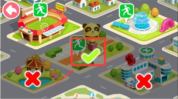 2、选择地图中正确的地震逃避场景,选择正确的场景会出现√。