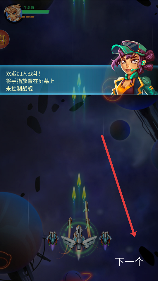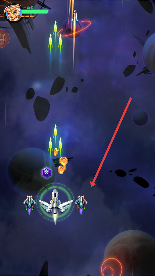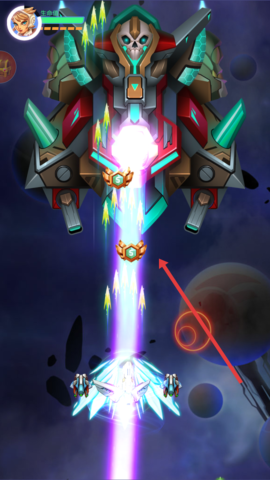 1、开局跟着引导走,单手长按控制战机在枪林弹雨中蛇皮走位。