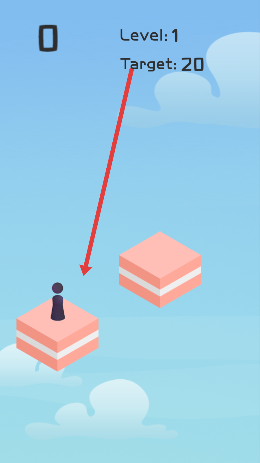 2、游玩中,控制黑色小人跳跃到相邻方块上,注意上方显示的关卡和目标分数,通过精准跳跃积累分数。