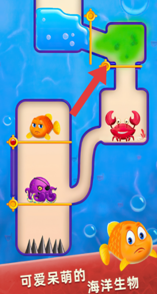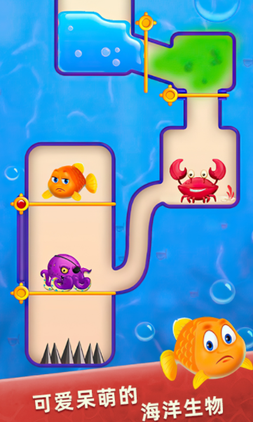 2、风格卡通可爱,画面呈现管道场景,有小鱼、螃蟹、章鱼等海洋生物,还有尖刺、水等元素,玩家需思考拉针顺序,引导水流,避开危险,解救小鱼。