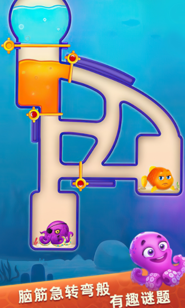 3、画面展示了管道结构,有小鱼、章鱼等海洋生物,还有水和不明橙色液体,玩家需开动脑筋,像解脑筋急转弯一样思考拉针顺序,引导液体流动。