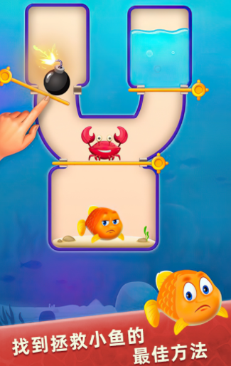 1、采用卡通风格,画面中有U型管道,提示玩家需通过合理拉动管道中的拉针,引导水流、避开危险(如炸弹、螃蟹),找到解救小鱼的方法,完成关卡挑战。
