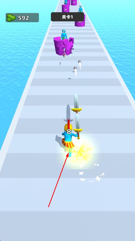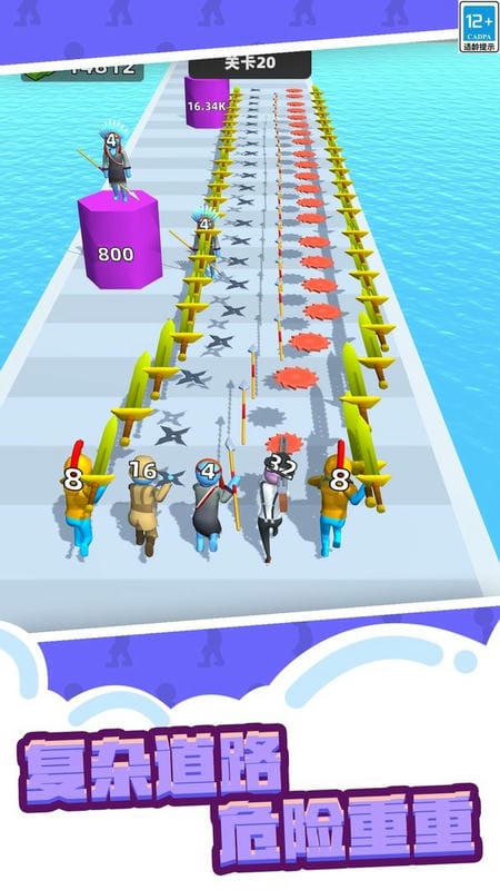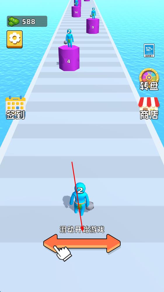 1、进入人类武器超进化,操控初始队伍击碎首个障碍物,收集低级战士,开启边跑酷边合成进化的冒险征程。
