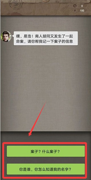 1、游戏是一个个故事的形式进行,我们通过与不同的人对话,了解案件的情况和推动剧情进展,对话方式是点击下方的聊天词条,选择一个发送,回答对方的话。