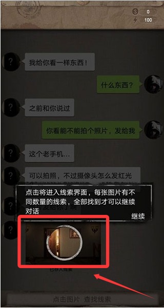 2、在聊天过程中,对方会发送一些图片,每张图片都是案发的一些场景,里面都隐藏着线索,找出线索才可以继续对话,推动剧情。