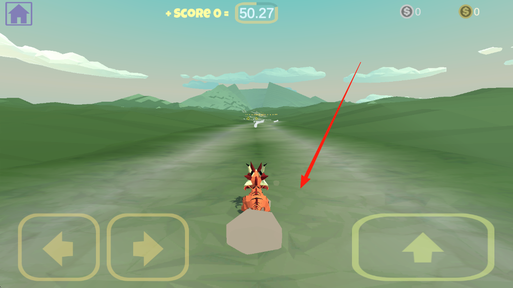 2、通过屏幕下方左右方向键控制小龙转向,上方向键可能用于跳跃等操作,躲避障碍物,收集道具,获取分数。