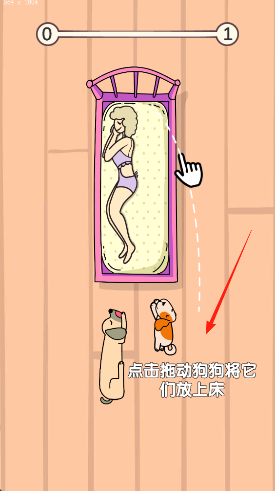 1、在游戏前期关卡中,按照“点击拖动狗狗将它们放上床”的提示,点击并拖动狗狗至床上,完成关卡任务。