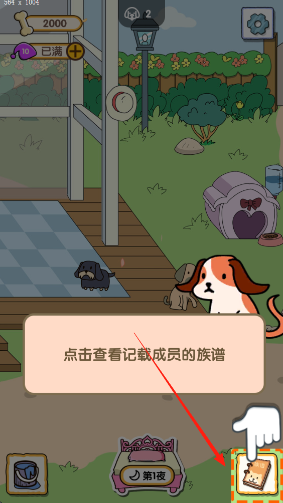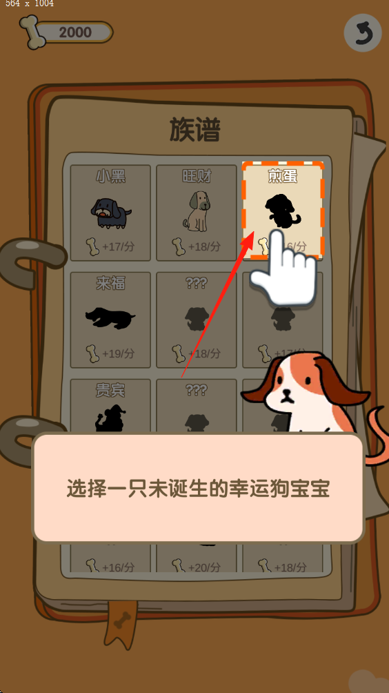 3、在族谱界面,依据“选择一只未诞生的幸运狗宝宝”提示,挑选对应的狗狗图案,进行相关操作。