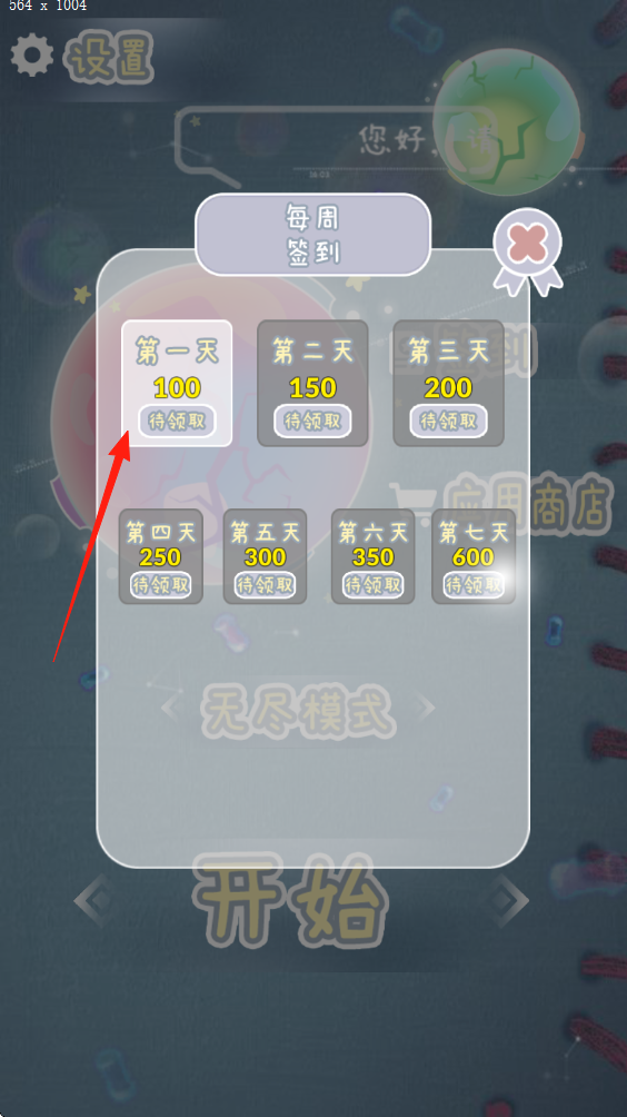 3、回到主界面,点击“每周签到”,在弹出界面中,点击“第一天100待领取”,领取签到奖励,积累资源。