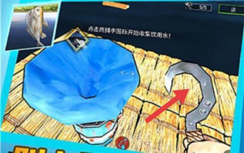 2、点击钩子图标,开始收集饮用水,保障生存需求。