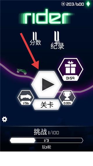 3、游戏结束后,在结算界面,点击中间的播放按钮(如箭头所指),可重新开始关卡,继续挑战,冲击更高分数和纪录,完成“挑战1/100”等任务目标。