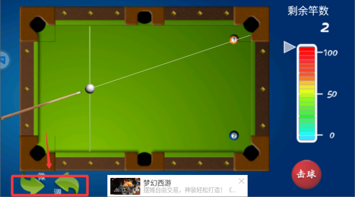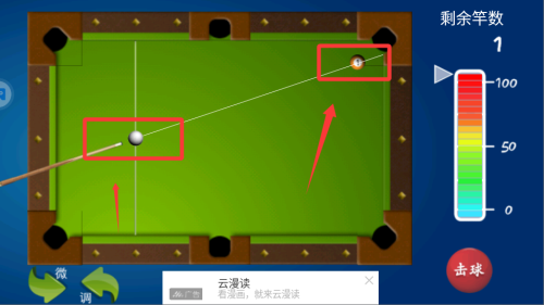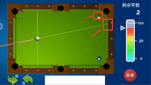 2、利用反弹是进阶技巧,当直线击球受阻时,可以瞄准台边反弹击中目标球。