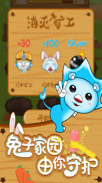消灭矿工是一款融合经典打地鼠玩法的休闲益智游戏,玩家化身家园守护者,操控兔子通过点击屏幕击退化身矿工的小狮子,在限时挑战中守护庄园安全,体验卡通画风下的趣味攻防战,适合全年龄段玩家享受轻松解压的闯关乐趣。
