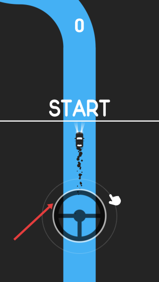 2、进入游戏后,通过操控屏幕上的方向盘图标(如箭头所指)控制车辆在蓝色道路上行驶。