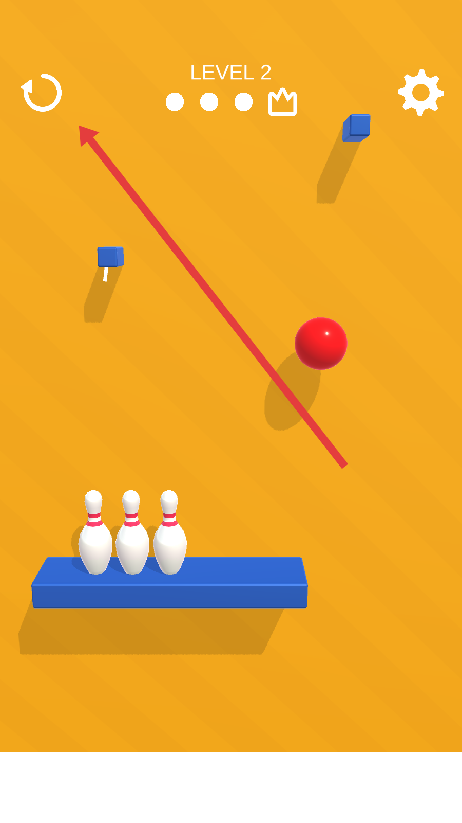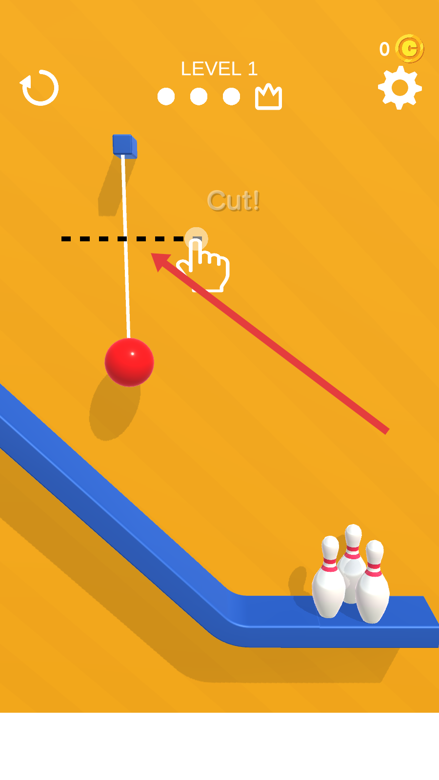 1、进入游玩关卡,按照提示“Cut!”,点击虚线处切断绳子,让红色小球滚落击倒保龄球。