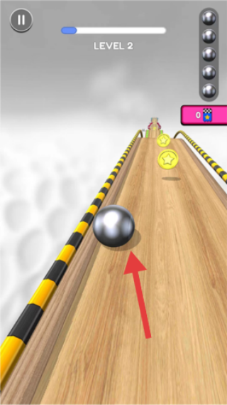 1、在【LEVEL2】关卡操控银色小球在木板赛道上前进,收集金币等道具。
