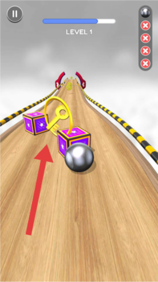 2、在【LEVEL1】关卡里控制小球撞击紫色方块和黄色钥匙,清除赛道障碍。