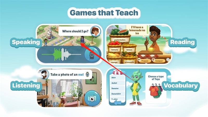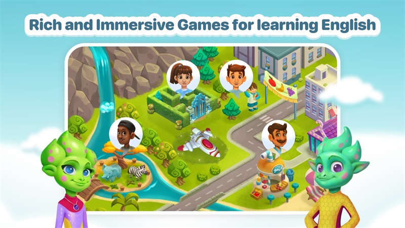 2、学习系统:通过互动游戏与练习掌握英语知识,合理利用学习道具与提示突破难点,连续完成高难度任务触发成就奖励,获得额外学习资源,灵活应对不同类型的学习内容。
