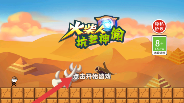 1、画面呈现沙漠场景,有金字塔等元素,下方有【点击开始游戏】提示,玩家点击即可进入,玩家将操控火柴人经历有趣冒险、解开各类谜题。