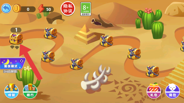 2、背景是沙漠场景,有金字塔、仙人掌等元素,画面中有多个宝箱样式的关卡图标,箭头所指标有1的是第一关,玩家可在此界面选择关卡开启游戏。