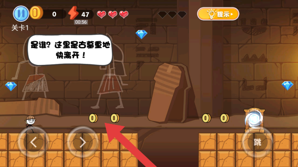 3、对话框文字营造出紧张氛围,场景中散落着金币和钻石,需要收集的道具,玩家操控火柴人在此场景中完成关卡任务,涉及躲避危险、收集物品等玩法。