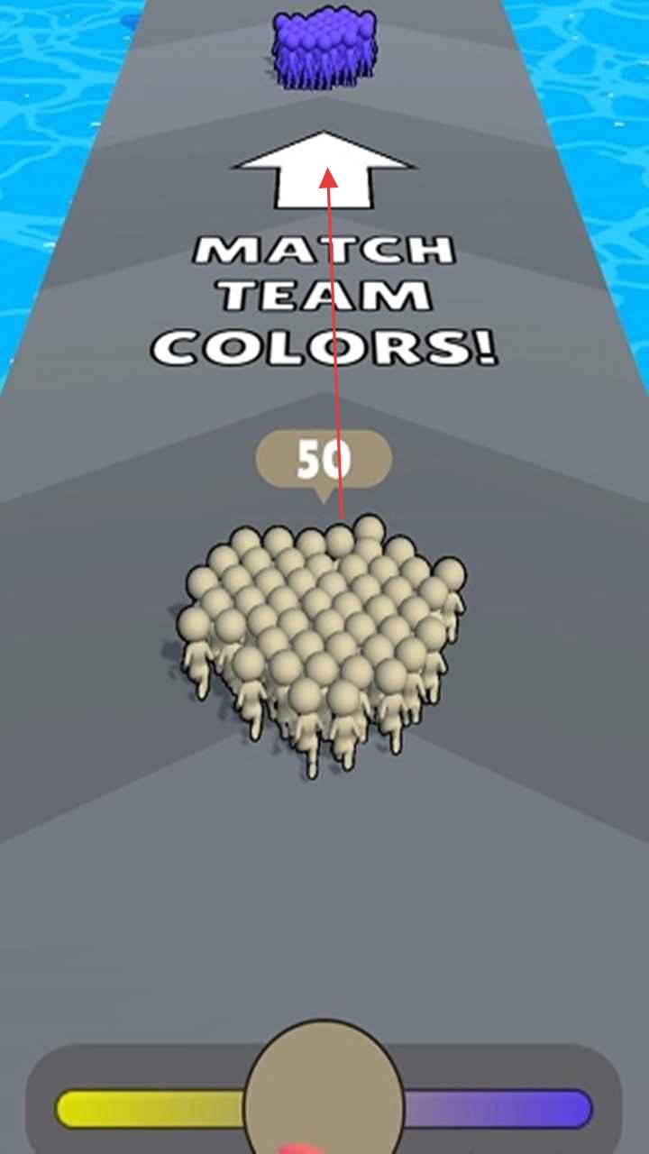 2、滑动变换颜色:在冲刺过程中,根据需要滑动屏幕变换人群颜色,以便收集相同颜色的人群。