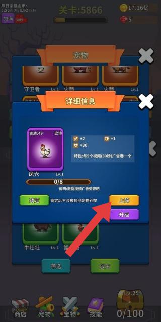 2、界面中上阵按钮被箭头指向,点击该按钮,宠物周六就能参与战斗,为玩家提供助力,此外,还有锁定防止被其他宠物吞掉、升级提升宠物能力等功能按钮。