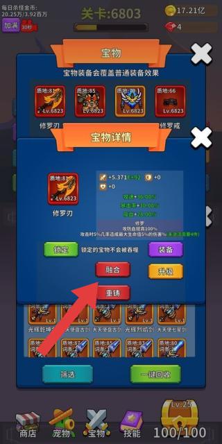 3、箭头所指的【重铸】按钮,点击后应该可对修罗刃的属性进行重新铸造,即改变其现有属性数值或属性类型,让玩家有机会获得更理想的属性,从而提升角色实力。