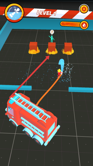 2、游玩中,操控消防车按箭头指示方向喷水,扑灭场景中的火焰,救助被困小人。