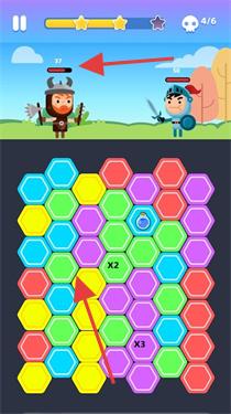 1、玩家在六边形消除界面中,通过消除彩色方块完成关卡任务,击败关卡中的敌人。