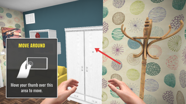 3、按照【MOVE AROUND】提示,在相应区域移动拇指,操控角色在场景中移动,探索如衣柜等不同地点,为后续任务做准备。