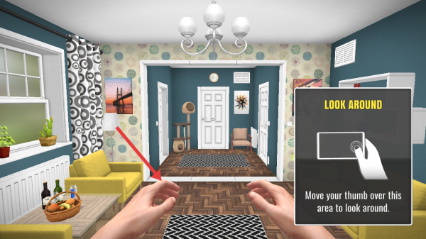 2、进入游戏场景后,依据【LOOK AROUND】提示,在指定区域移动拇指,观察客厅等场景内的物品和布局,熟悉环境。