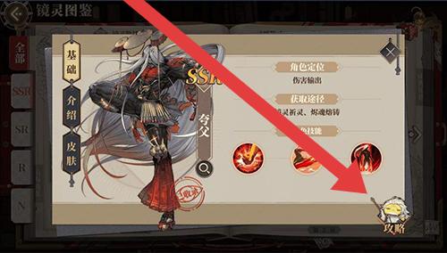 1、进入镜灵图鉴界面,可查看如【夸父】等SSR镜灵信息,点击右下角【攻略】,获取其培养与战斗技巧。