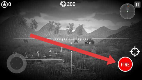 3、瞄准敌方坦克或目标后,点击屏幕右侧【FIRE】按钮发射炮弹,利用抛物线弹道特性精准命中目标。