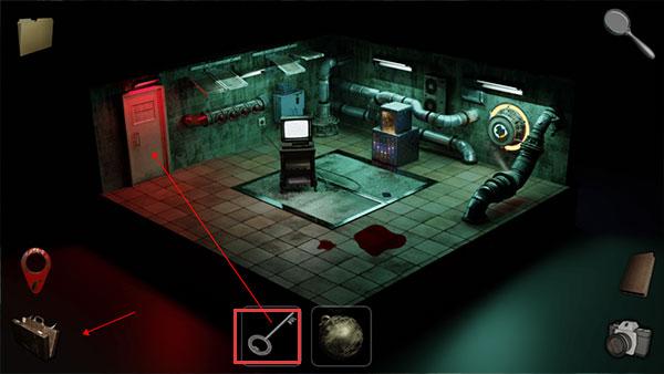 3、打开左下角的背包,获取钥匙,点击打开门,穿过走廊就能进入另一个房间了。