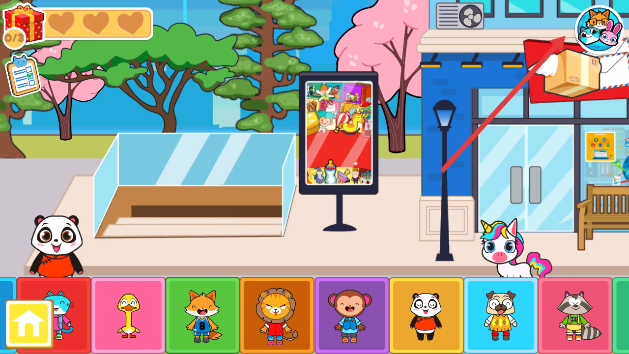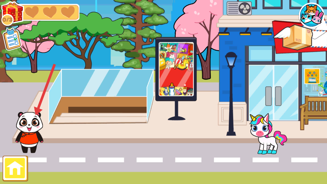 2、进入游戏后,按照红色箭头指示,点击场景中的熊猫角色,可能触发相关任务或互动。